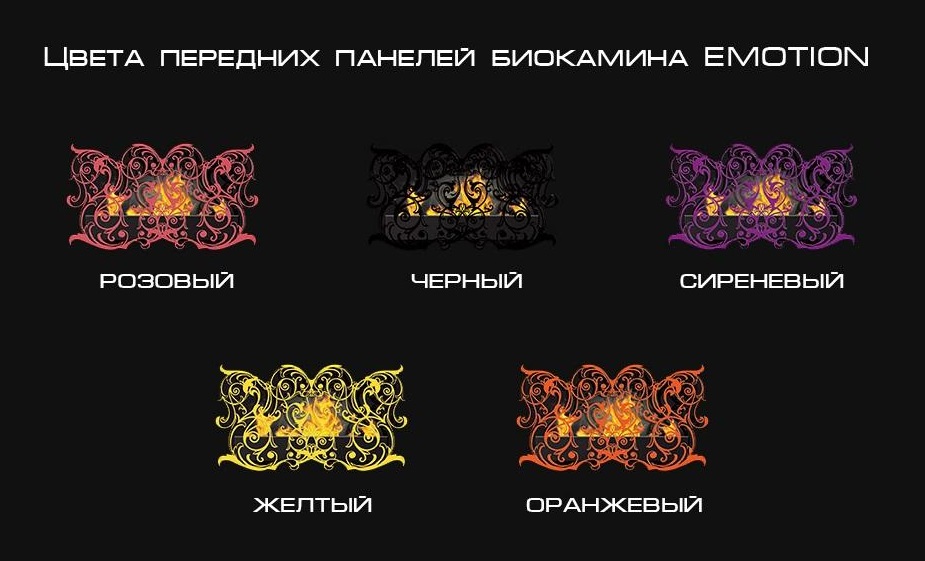 Камин сочетает в себе многообразие цветовых решений, оригинальный дизайн и удобство. Emotion может использоваться как настенный, так и как напольный камин. Передняя панель выполнена из 6-ти миллиметрового металла с причудливым рисунком, напоминающим ковку. Биокамин Emotion оснащён уникальной боковой задвижкой, позволяющей плавно регулировать высоту пламени.