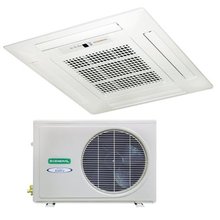 Данный тип кондиционеров относится к сплит-системам, которые крепятся к потолку помещения и позволяют направлять охлажденные потоки воздуха в нескольких направлениях. Энергосберегающая опция автоматически настраивает кондиционер на низкую мощность работы, что позволяет поддерживать комфортную комнатную температуру в помещении, не прибегая к многократному включению и остановке компрессора. Компактный блок, простой монтаж, низкий уровень шума делает данный вид кондиционера идеальным для небольших магазинов, кафе и офисов.